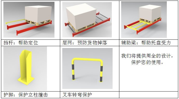 我們也將為您規(guī)劃倉庫的合理布局,和選擇適合的配件。 我們將根據(jù)您提供的信息,選擇適合的材料規(guī)格。 產(chǎn)品所使用的安全配件: