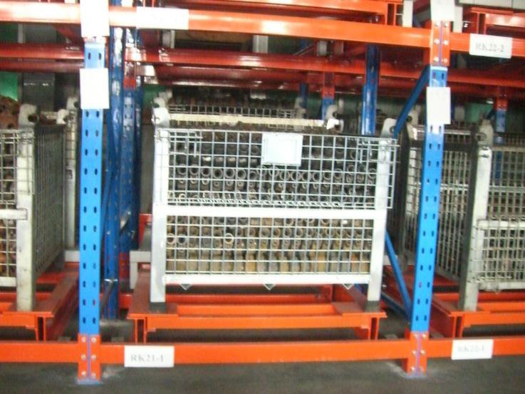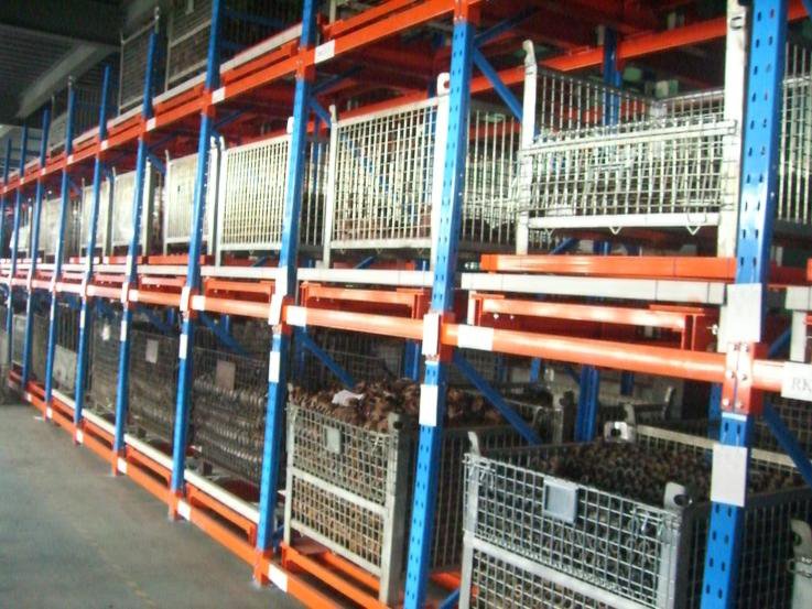 從前推入的貨架:采用軌道和托盤小車相結(jié)合的原理,軌道呈一定的坡度(3°左右),利用貨物的自重,貨物被規(guī)定于單端存儲(chǔ),貨物先進(jìn)后出,適用于大批量少品種的貨物存儲(chǔ),空間利用率很高,存取也較靈活方便。貨架總深度不宜過深,一般在6個(gè)托盤深度以內(nèi),否則由于托盤小車相互嵌入的緣故而會(huì)使空間犧牲較大。單托貨物重量一般在1500kg以內(nèi),貨架高度一般在6m以下。