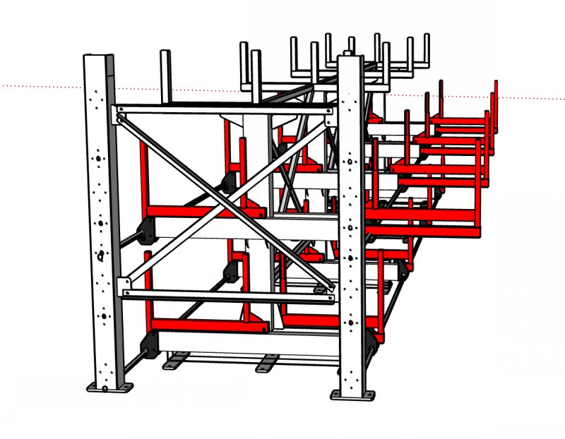 懸臂式貨架尺寸 高度:4000mm 長度:5600mm 寬度:1560mm 懸臂:100%伸縮 雙面懸臂 層數(shù):5層 承重:1000~5000kg 非標(biāo)可定做